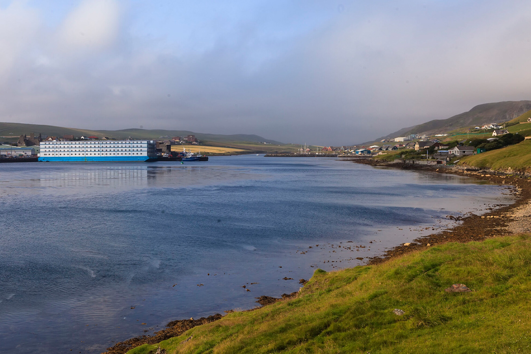 Trent arrived in Scalloway, to provide accommodation for hundreds of BP workers undertaking a major long term maintenance programme at Sullom Voe oil terminal. The terminal located in Scotland, was built between 1975 and 1981 during its construction 6,000 people were employed, it is one of the biggest oil and liquefied gas terminals in Europe.
