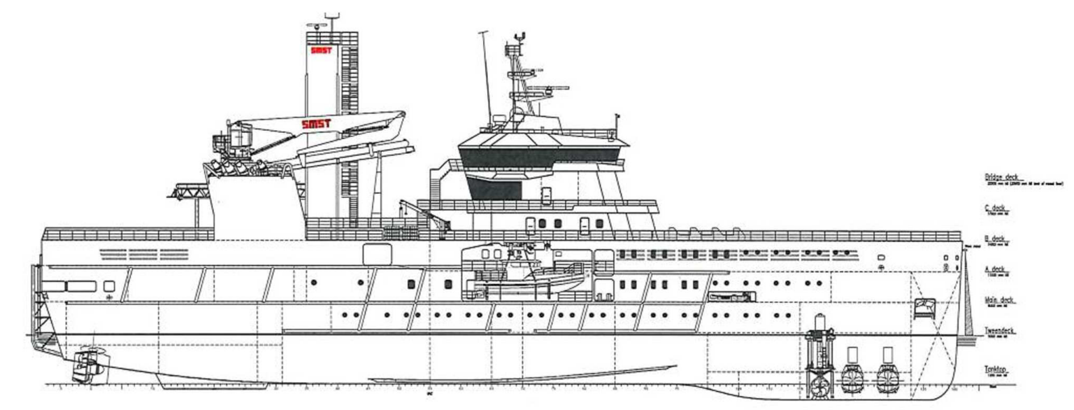Basic functions – To provide stepless access onto windfarm assets for technicians, tools and parts by access system, crane and daughter craft. Purpose-built for long-term O&M charter in North Sea offshore wind farms